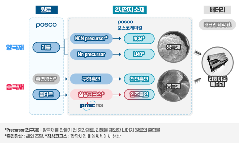 포스코는 양극재 및 음극재 원료인 리튬과 콜타르를 공급하며, 포스코케미칼에서 이를 원료로 NCM* (니켈, 코발트, 망간), LMO*(리튬, 망간, 산화물)등의 양극재 및 천연흑연 음극재를 생산해 배터리 제작社에 공급한다. 올해부터는 그룹사인 피엠씨텍에서 생산하는 침상코크스를 활용한 인조흑연 음극재 사업도 추진할 계획이다.