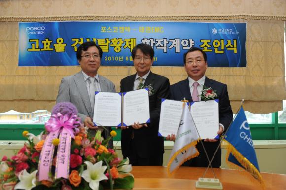 ㈜포스코켐텍(사장 이상영)은 2010년 5월 25일 종합회의실에서 이상영 사장을 비롯한 임직원, 태영EMC 김병환 사장 등 관계자들이 참석한 가운데 고효율 건식탈황제인 고반응소석회 생산공장 설립을 위한 합작계약을 체결했다. 합작회사(포스그린)의 지분구조는 포스코켐텍과 태영EMC가 각각 60:40의 지분율로 참여하게 되며, 2010년 7월에 착공하여 12월에 준공 및 생산에 들어갈 예정이다. 원활한 원료 조달과 신속한 제품 공급을 위해 제철소 내에 부지를 마련하여, 연산 3만톤 규모의 생산공장을 건설키로 합의하고 금년 내 80여억원을 투자 할 계획이다. 고효율 건식탈황제로 개발된 고반응소석회는, 국내에서 매장량이 풍부하고 가격이 안정적인 석회석을 가공한 생석회를 이용하여 폐기물소각로, 화력발전소, 사업장연소시설, 보일러(Boiler) 등에서 배출되는 환경오염물질인 황산화물(SOx), 염화수소(HCl) 등을 건식 상태에서 제거하는 환경제품이다. 고반응소석회는 특화된 기술을 적용한 제조공법으로 기존의 일반소석회가 갖지 못하는 반응성을 배가하여 오염물질을 제거함으로써 탈황 시 발생되는 폐수발생의 2차오염을 유발하지 않는 건식환경약품이다. 고반응소석회의 원료인 생석회는 포스코켐텍 자사 제품을 사용함으로써 가격 경쟁력이 높을 것으로 전망된다. 고반응소석회가 본격적으로 생산되면, 현재 중국에서 수입하여 사용하고 있는 가격이 비싸고 수급이 불안정한 중조를 대체 할 수 있을 것으로 판단된다. 포스코켐텍은 습식 탈황약품인 수산화마그네슘(Mg(OH)2) 제조 판매에 이어, 금번에 건식탈황약품인 고반응소석회를 생산 판매하게 되면, 종합 습식·건식 탈황약품 제조 판매회사로서 국내 시장을 선도할 것으로 기대하고 있다.
