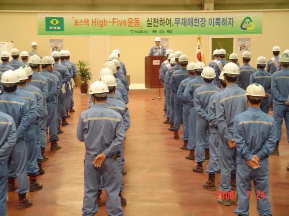 포스코 종합로재 전문 계열회사인 ㈜포스렉(사장 황원철) 광양로재정비부문은 7월 24일 광양로재정비부 혼선차 수리장에서 “포스렉 High-Five 운동” 선포식을 가졌다. 이번 선포식의 의미는, 안전의식을 재점검하고 경미한 사고도 용납치 않겠다는 의식전환이 필요한 안전활동의 혁신이 요구되는 계기 및 사망재해 위험이 높은(High) 5대(Five) 위험작업에 대해 노?사가 협력하여 예방활동을 전개해나가는 사망재해 예방 실천운동임을 전직원이 공감하는 자리였다. 신기철 전무이사를 비롯한 광양지역 과장급 이상 간부사원과 정종훈 노동조합 광양지부장, 100여명의 현장직원들이 참석하였으며, 대외적으로는 한국산업안전공단 전남동부지도원장 및 POSCO 노재과장 등이 참석하여 안전슬로건 및 격려사(전무이사, 지도원장), 결의문을 낭독하고 안전결의를 다졌다. 특히 신기철전무이사는 격려사를 통해 “오늘 우리는 안전활동의 혁신을 본격적으로 추진할 포스렉 High-Five 운동의 시작을 선언하고, 말보다는 실천하는 안전활동으로 항구적인 무재해가 이루어질수 있도록 새롭게 각오를 다지기 위해 이 자리에 함께 하였다”라고 말하며, “포스렉 High-Five 운동”은 ①중량물 취급작업 ②청소 등 정리작업 ③가스취급작업 ④믹서기, 캇타기 취급작업 ⑤고열작업 등 5대 위험작업을 선정하여 해당작업중 발생할 수 있는 사고를 사전에 예방하기 위한 종합적인 안전사고 예방활동으로써 안전은 행복을 위한 약속이며 그런 의미에서 포스렉 High-Five 운동은 우리 모두가 안전수칙을 준수할 것을 자기자신에게 뿐만 아니라 동료나 가족에게 약속함으로써 재해없는, 정말 일하고 싶은 일터를 만들고 행복한 가정을 가꾸기 위해 이 약속은 꼭 지켜져야 하고 지속적으로 전개되어야 한다”고 당부 하였다.