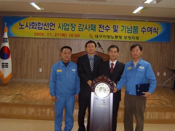 포스코 종합로재 ㈜포스렉 (사장 이상영)은 노사화합선언 우수기업으로 선정되어 11월 27일 포항종합고용안전지원센터에서 대구지방노동청장의 감사패와 포항지청장의 기념품을 수상