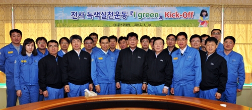 포스코켐텍(사장 김진일)은 전사 녹색실천운동「I Green」의 비전과 로드맵을 선포하는 Kick-Off 행사를 지난 1월 30일에 가졌다.「I Green」은 “나(I)부터 녹색(Green)생활을 실천하겠다!”라는 포스코켐텍의 환경경영 의지를 담은 저탄소 운동이다. 기존에 포스코패밀리가 실시했던 Green Walk 활동을 구체화하면서 임직원은 물론 가족들도 생활 속에서 손쉽게 동참할 수 있도록 자가진단용 녹색실천운동 기준표를 명확하게 제시한 것이 특징이다. 김진일 사장은 ‘걷기, 끄기, 줄이기, 모으기, 지키기’로 구성된「I Green」의 5대 녹색실천 서약서를 임직원 대표로 작성하며 “에너지 절약, 자원 재활용 등 다양한 그린 캠페인 활동을 계속 실시해 글로벌 수준의 환경경영체제를 구축해 나가겠다"고 말했다. 한편 포스코켐텍은 지난해 12월에 ISO 14001 환경경영시스템 인증을 받아 친환경 경영시스템과 유지관리 능력을 공인 받은 바 있다.