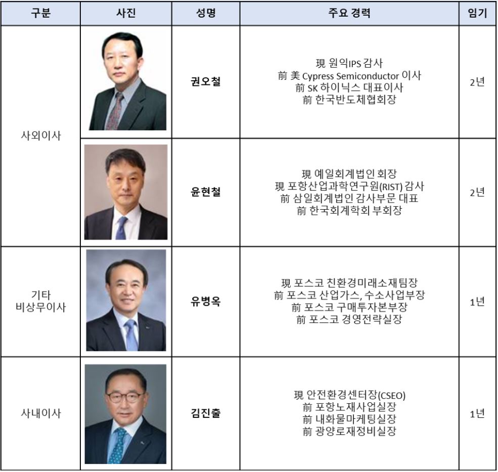 사외이사는 3명에서 5명으로 확대하며, 신임 후보로는 권오철 前 SK하이닉스 대표이사와 윤현철 現 예일회계법인 회장을 추천하고, 전영순 現 사외이사는 재추천했다. 사내이사 신임 후보로는 최고안전환경책임자(CSEO)를 추천했다.