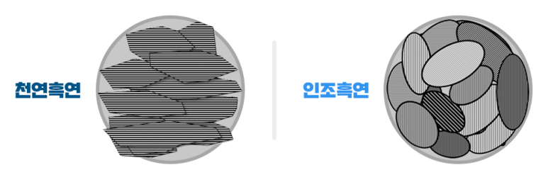 천연흑연과 인조흑연 중에서는 인조흑연의 선호도가 더 높은데요. 천연흑연은 땅속에서 탄소 성분이 오랜 시간 고온·고압 상태로 층층이 쌓인 판상형 형태를 띱니다. 판상형 사이의 틈으로 리튬 이온이 이동하면서 전류가 흐르는 것이죠. 하지만 천연흑연은 전류의 이동경로가 양옆 두 곳 밖에 없어서 충·방전 효율이 떨어지고, 배터리를 계속 사용하면 층이 벌어져서 부푸는 ‘스웰링 현상’이 일어나기도 합니다. 하지만 인조흑연은 리튬 이온의 이동 경로가 많아서 효율이 높아 급속충전에 유리하고, 안정적인 등방형 구조이기 때문에 스웰링이 적고 배터리 수명을 늘릴 수 있어요. 시장 규모도 천연흑연 음극재보다 인조흑연 음극재가 더 큽니다. 2019년 시장조사업체 야노경제리서치의 분석에 따르면, 2016년부터 2020년까지 인조흑연 음극재의 연평균 성장률은 24%로, 15.6%를 기록한 천연흑연 음극재를 앞설 것으로 전망했습니다.