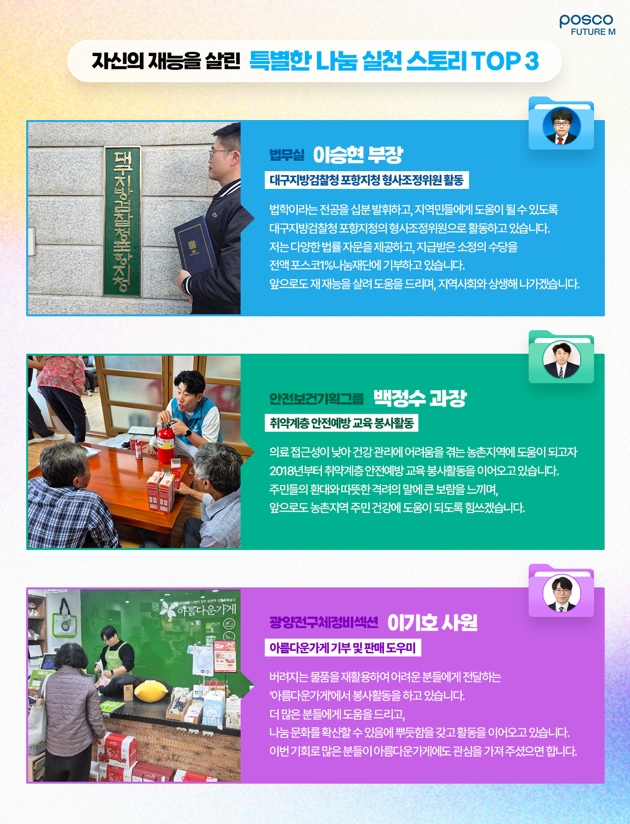 법률자문을 제공하며 지역사회에 기여하고, 여기서 받은 소정의 수당을 전액 포스코 1%나눔 재단에 기부해왔는데요.